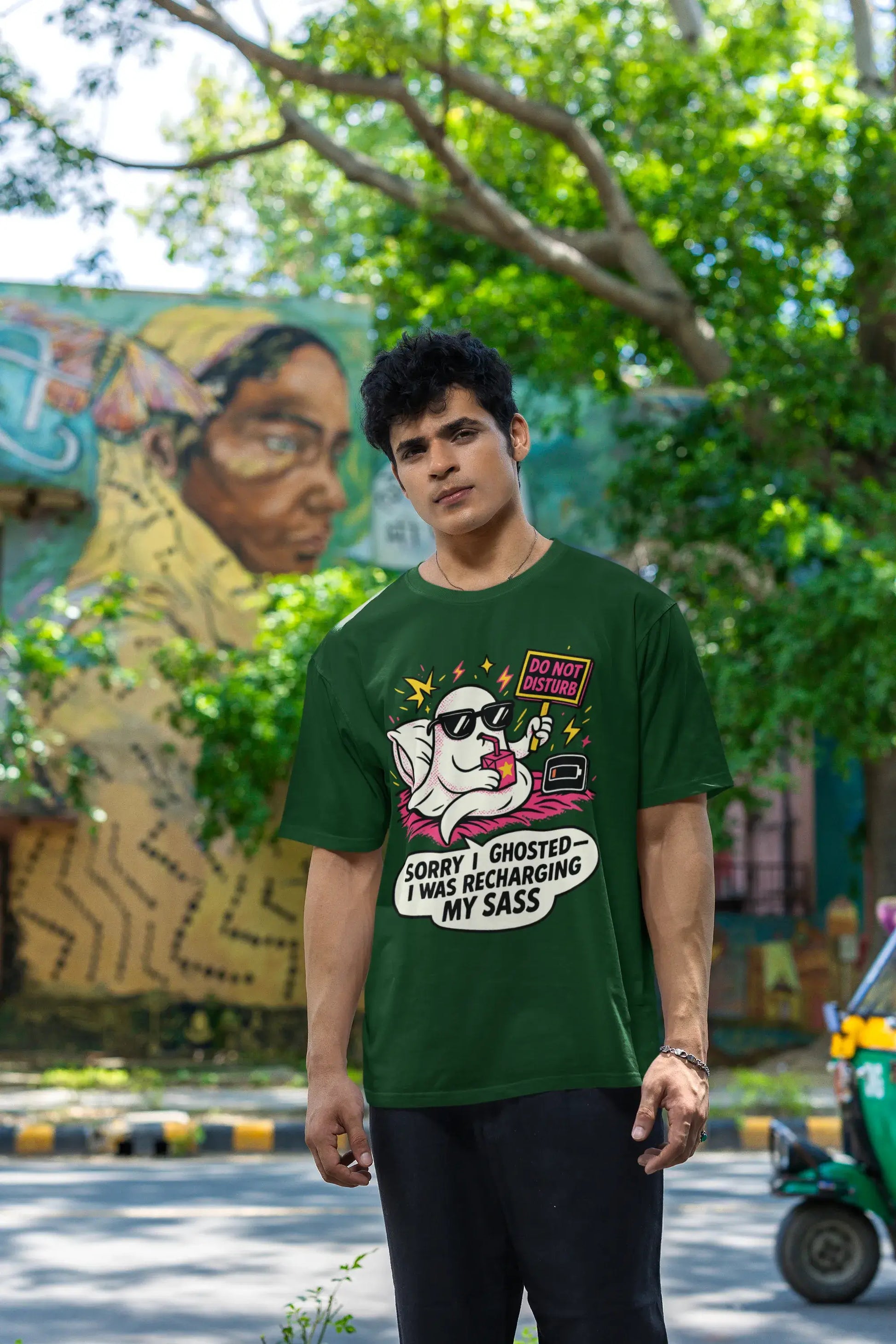 Featuring a bold comic-style ghost chilling in bed — sunglasses on, juice box in hand, and a cheeky “Do Not Disturb” sign. Surrounded by dreamy lightning bolts and a low battery icon, it’s the perfect expression of your social sabbatical.